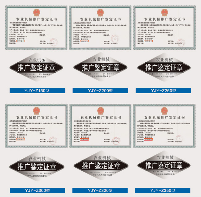 農業部專家鑒定委員會對益加益產品機進行用戶調查、設備封存、初檢、復檢、標準審查、鑒定公告、證書簽發等多個嚴格環節,于2006年、2010年和2015年對益加益榨油機等產品進行嚴格審查,完成了部級推廣鑒定工作。益加益榨油機連續三次產品推廣鑒定結論為通過,獲得農業部農機推廣鑒定。